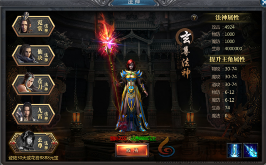 王者传奇游戏法神系统需要人物等级40级开启,角色死亡后,法神立即消失,法神出战有时间限制,时间耗尽法...
